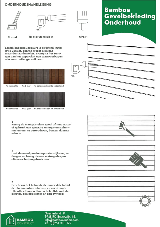 Download hieronder onze sheet voor onderhoud instructies. U kunt ons uiteraard ook benaderen voor project specifieke eisen voor uw project.