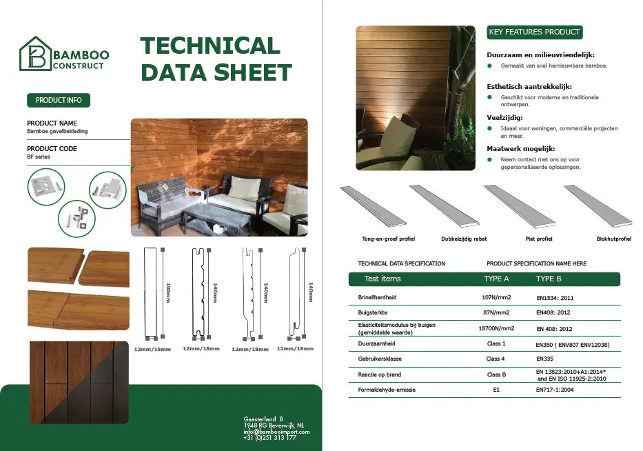 Onze bamboe gevelbekleding biedt de perfecte balans tussen duurzaamheid, esthetiek en functionaliteit. Met zijn natuurlijke uitstraling, moderne afwerking en uitzonderlijke weerbestendigheid is bamboe gevelbekleding een uitstekende keuze voor elk bouwproject. Of je nu een woning, bedrijfsgebouw of ander project wilt verfraaien, bamboe geeft een stijlvolle en milieuvriendelijke uitstraling die jarenlang meegaat.